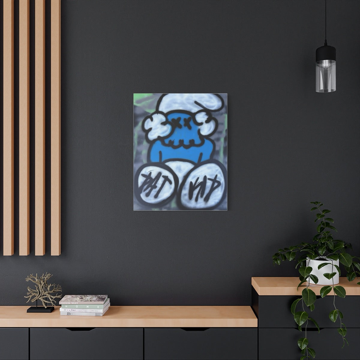 Death of a Smurf transforms childhood innocence into something raw and unsettling — a warped echo of the characters that once filled Saturday mornings with laughter. The bright blues and playful outlines clash against the dark, suffocating tones, symbolizing the decay of nostalgia. The spray-painted drips and heavy outlines suggest a rebellion against purity, a reminder that even joy fades when filtered through time and chaos.