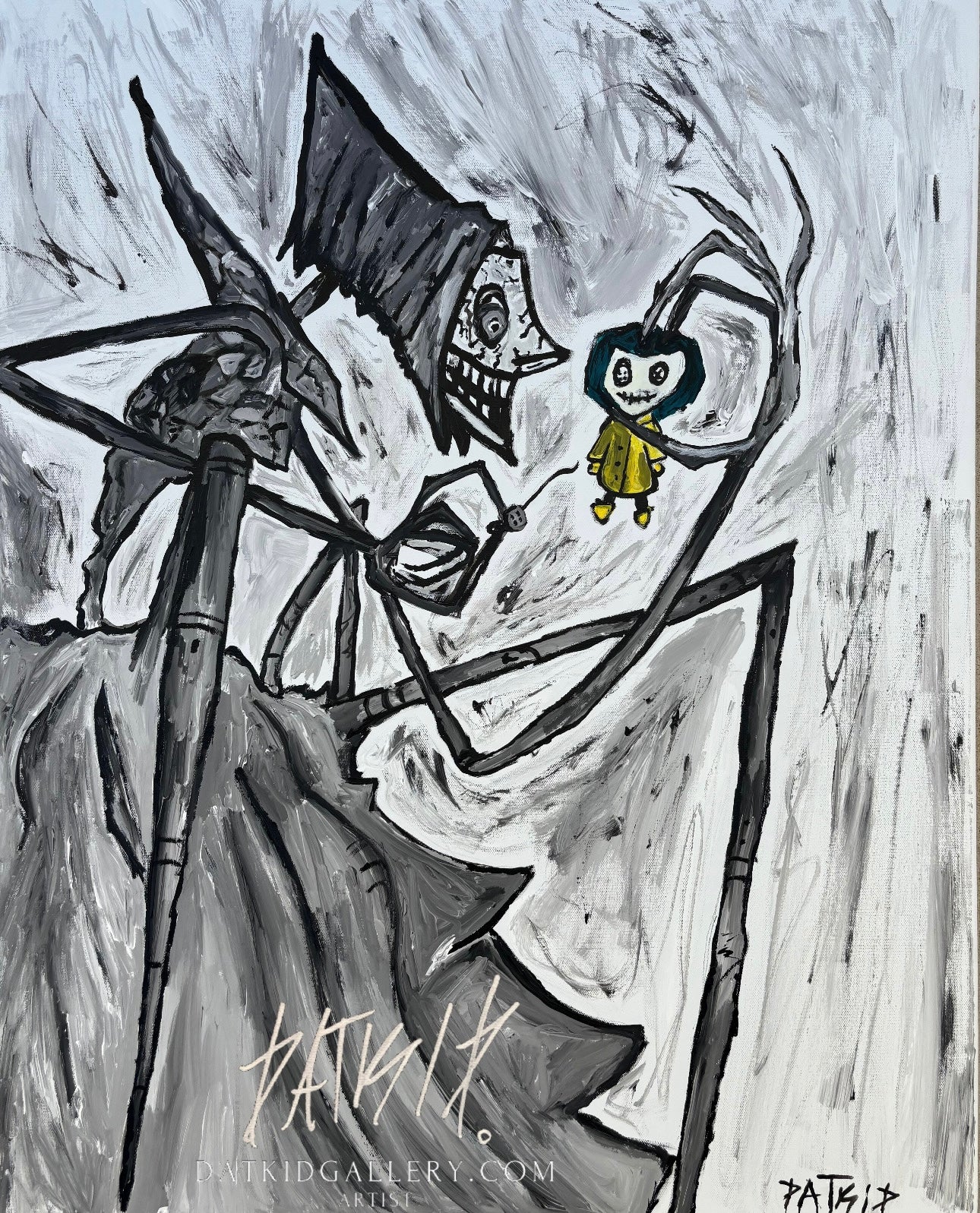 Inspired by the eerie charm of Coraline, Eyes Sewn Shut captures a haunting vision where childhood wonder meets unsettling fantasy. The stitched, button-like eyes of the central figure create an image that’s both captivating and unnerving, pulling you into a dreamlike world where beauty and darkness coexist.