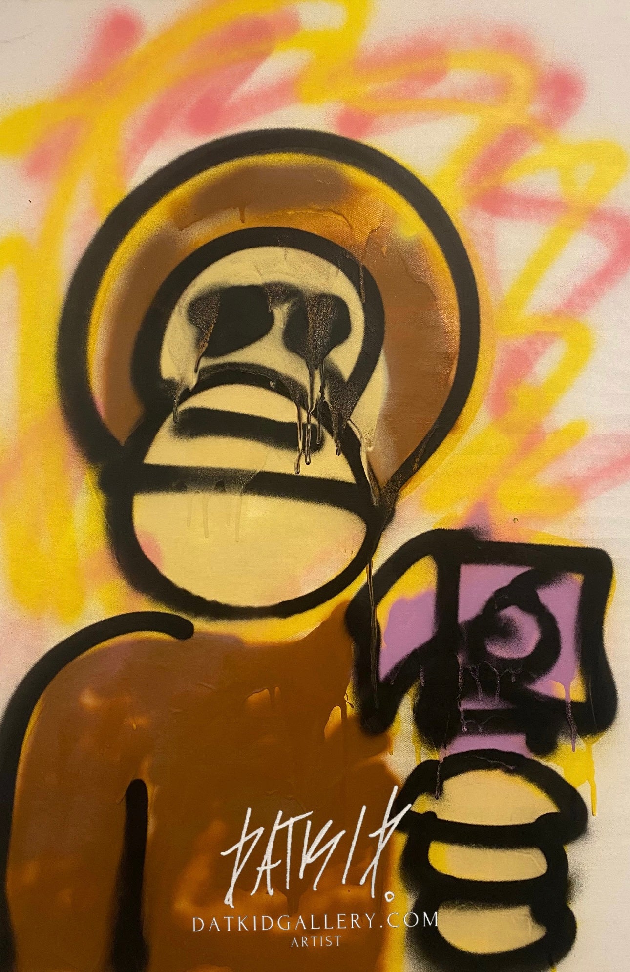 This 24x36” canvas brings Datkid’s rawest influences together: street survival, social critique, and a mind that never stops observing.