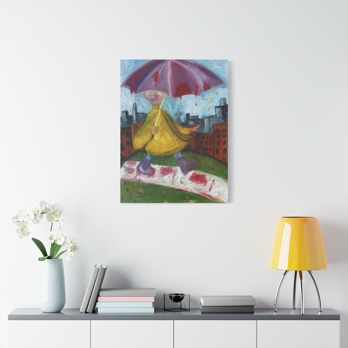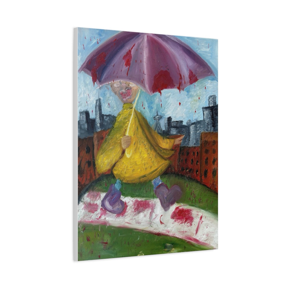 Red Rain captures innocence moving through a world that feels quietly wrong. The soft, almost playful colors clash with falling red drops, turning a familiar scene into something unsettling. There is no panic here—only acceptance. The figure keeps walking, unaware or unwilling to look up, as the environment slowly stains around them.