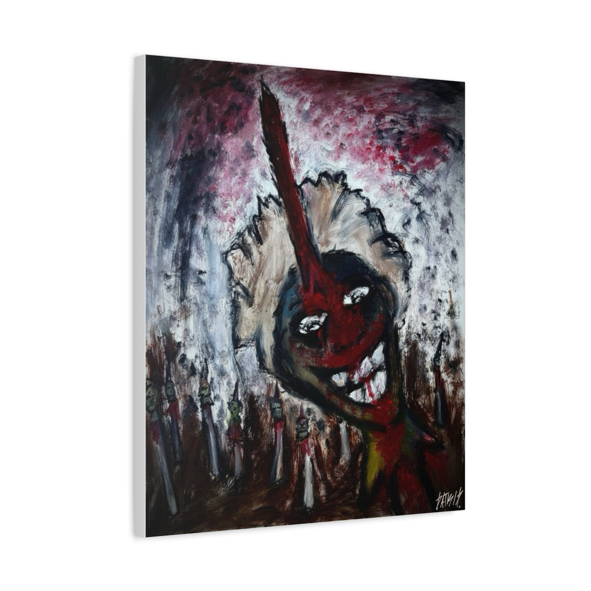 A nightmare pulled from the shadows, Spike captures the moment where madness and violence meet. The grotesque grin of the central figure, pierced through with a brutal stake, radiates both horror and twisted humor. Surrounding heads on spikes stretch into the distance, echoing a battlefield of chaos and despair.